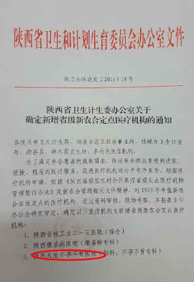 为了满足参合患者的就医需求,参合群众享受到优质、便捷的医疗服务,陕西天伦不孕不育医院通过坚持不懈的努力,经过上级导部门层层审批、严格考核、医疗服务现场考察被确定为省级新农合定点医疗机构。从2016年4月1日起,全省参合农民到我院就诊、住院都可以按规定予以报销。